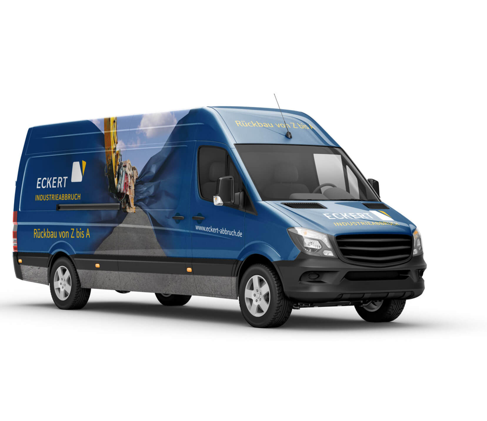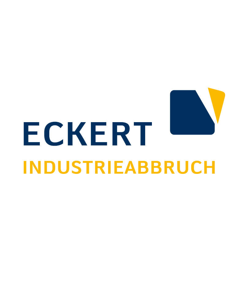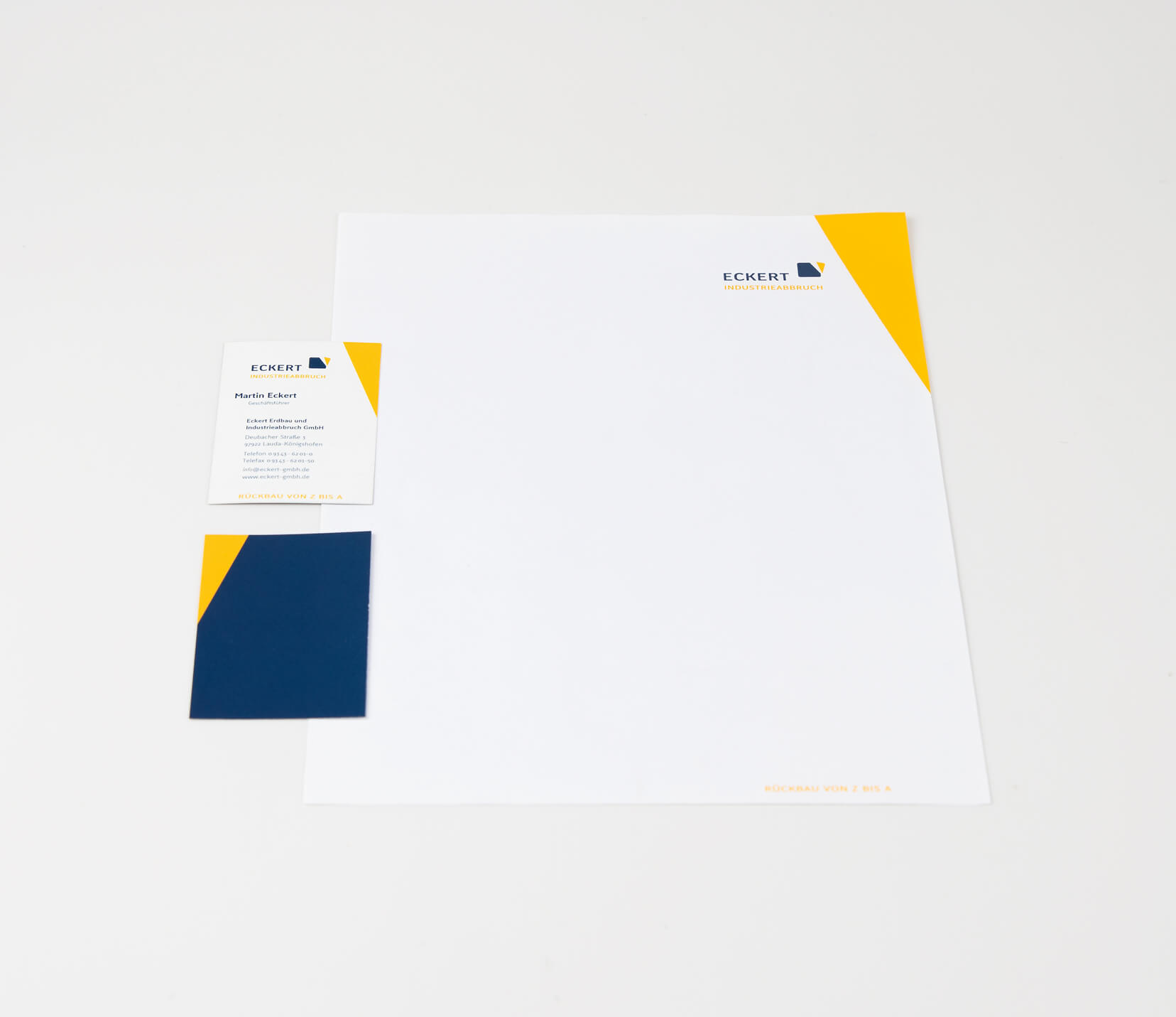 Für ECKERT Industrieabbruch entstand ein stringentes, aber dennoch flexibles Erscheinungsbild, das auf den (für ECKERT) wichtigsten drei Untergründen funktioniert: Weiß, Blau und Gelb. Der Slogan RÜCKBAU VON Z BIS A beschreibt auf eine originelle Weise die Firmenbezeichnung und der abfallende Keil dient als grafisches Stilmittel für den Abbruch.