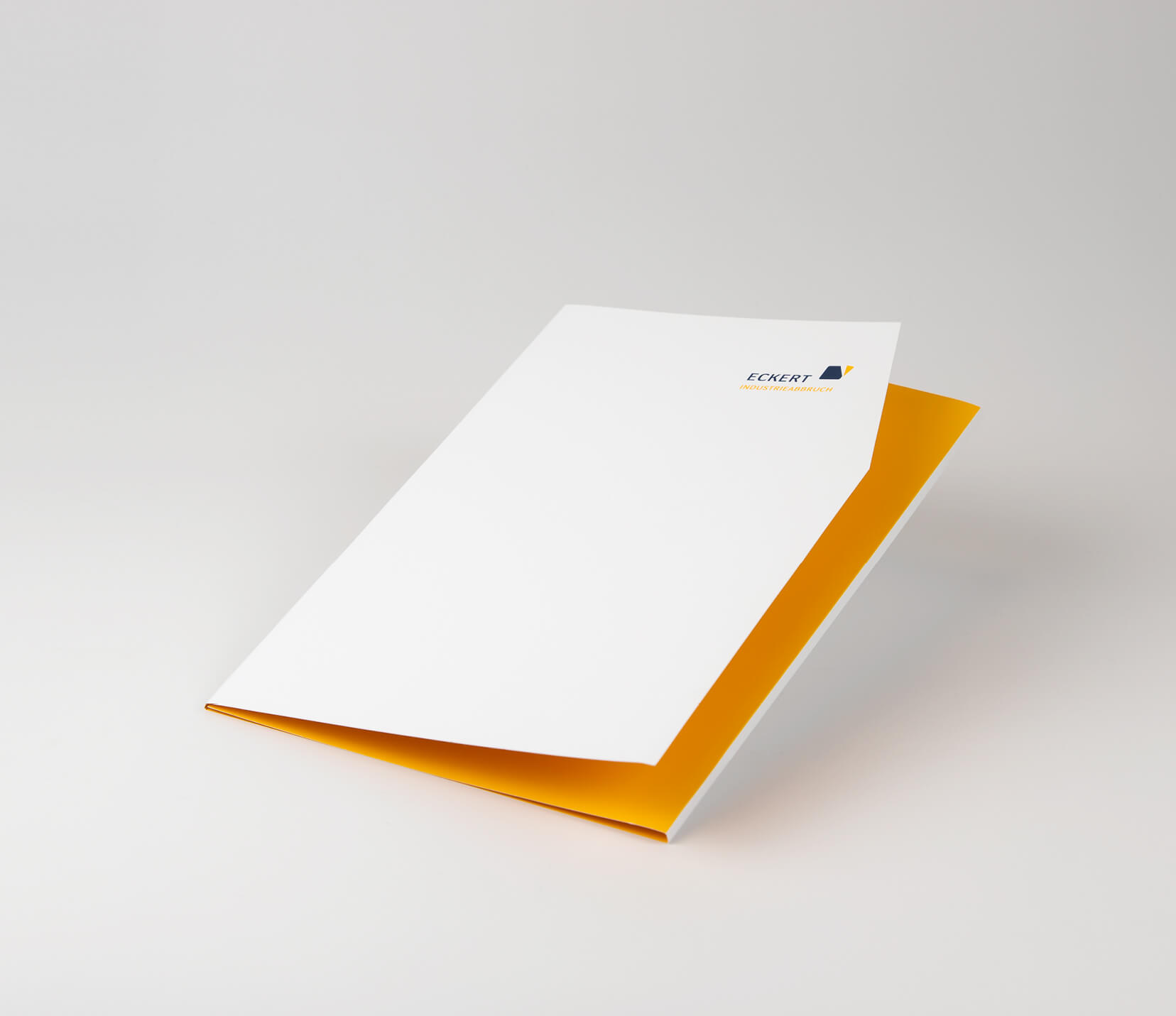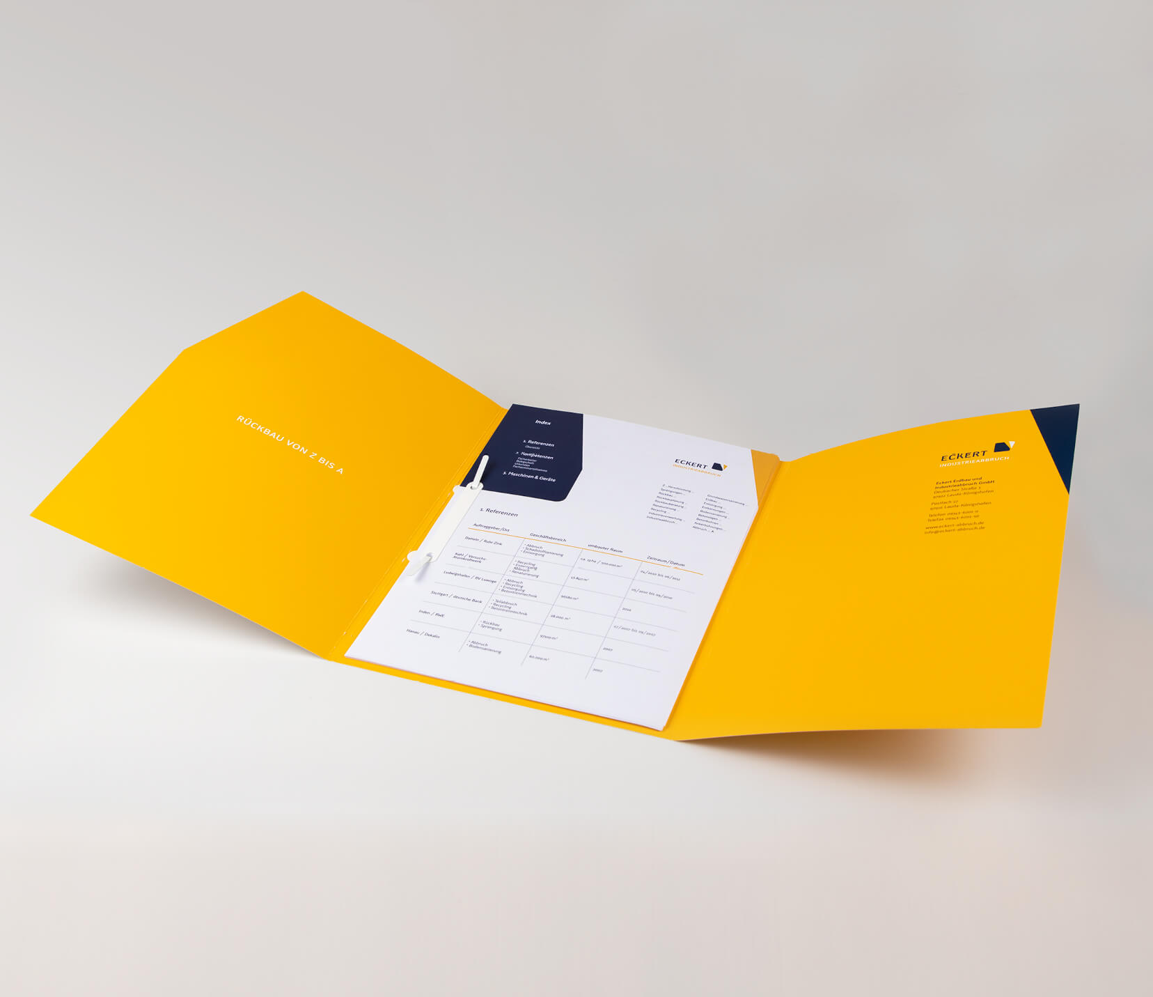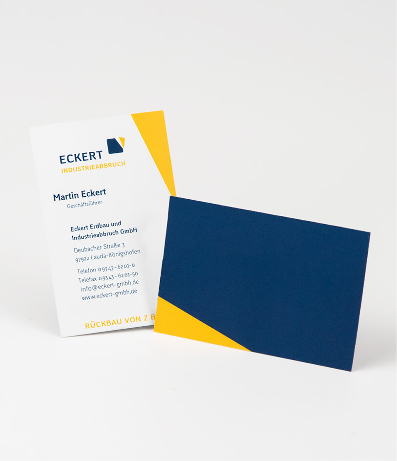 Für ECKERT Industrieabbruch entstand ein stringentes, aber dennoch flexibles Erscheinungsbild, das auf den (für ECKERT) wichtigsten drei Untergründen funktioniert: Weiß, Blau und Gelb. Der Slogan RÜCKBAU VON Z BIS A beschreibt auf eine originelle Weise die Firmenbezeichnung und der abfallende Keil dient als grafisches Stilmittel für den Abbruch.