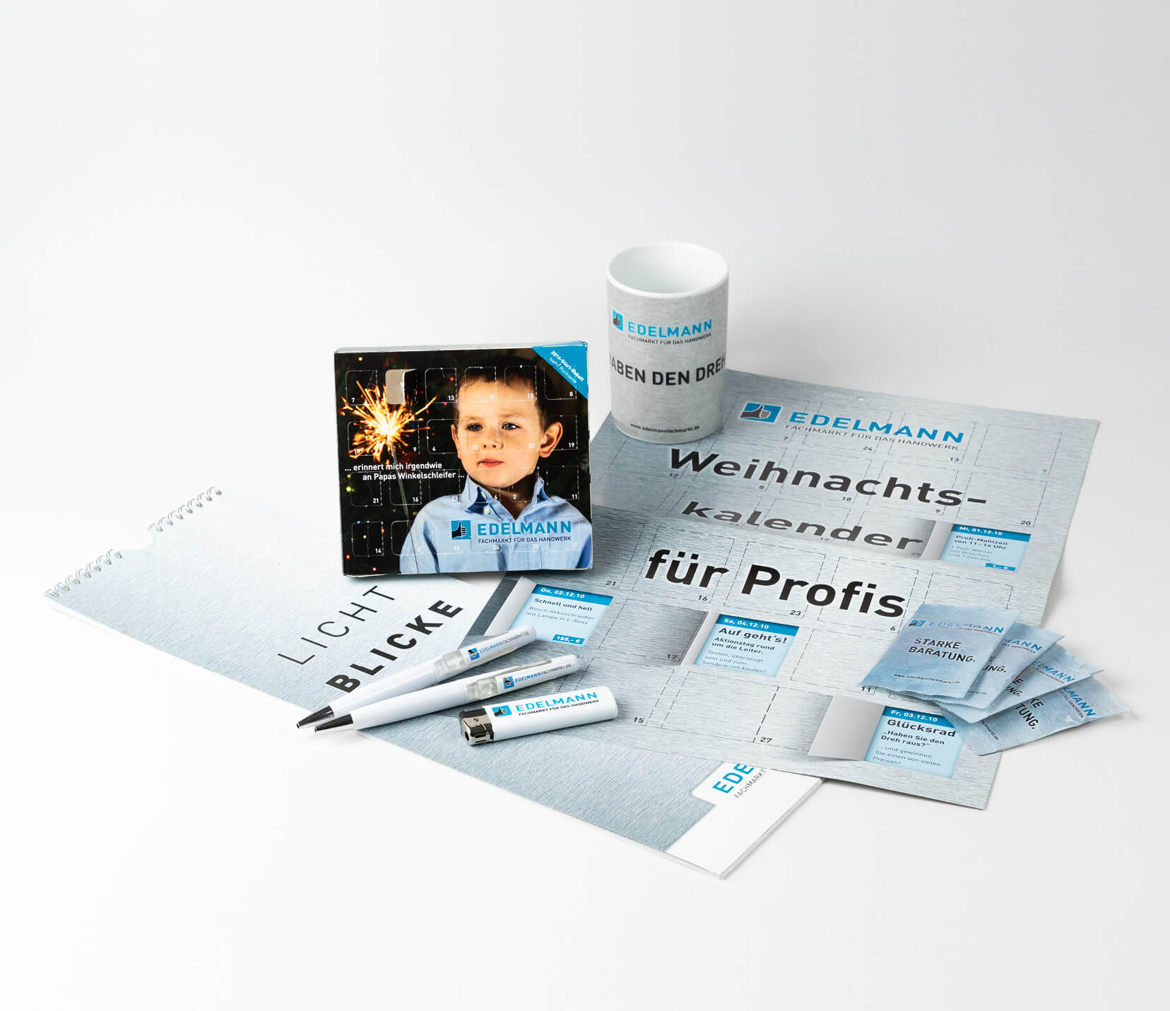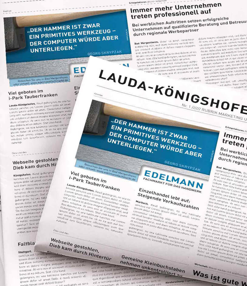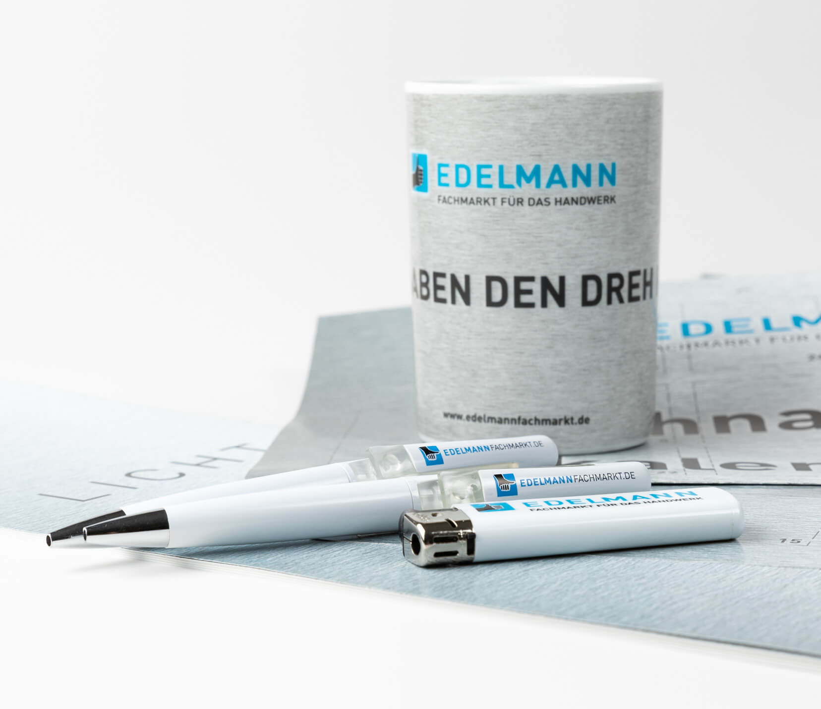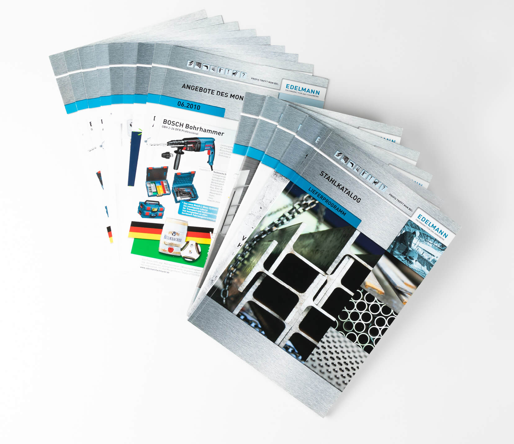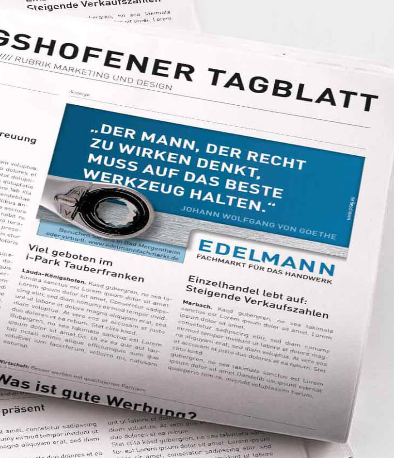 Bisher für Edelmann - Fachmarkt für das Handwerk realisiert wurden: Kommunikationsberatung und Neuausrichtung Corporate Design mit Logo, Typografie, Farbkonzept, Visuals, Claim, Anzeigen, Geschäftsdrucksachen, Kataloge, Direktmailings, Plakate, Prospekte, Arbeitsbekleidung, Radiowerbung, verschiedene Werbemittel wie Kalender, Streuartikel, ...