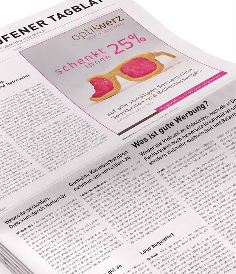 Brillen-Eigenmarke: "Gesucht ist ein Name, der Dynamik, Selbstsicherheit und Optimismus ausstrahlt. Ein Name, der neben gängigen Namen großer Marken mutig und frisch genug daherkommt, um gegen das Image von allseits Bekanntem zu kontrastieren. Wie lässt sich in diesem Namen auch der Unternehmensname wiederfinden?"